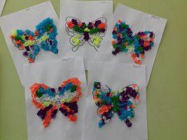 - Когда всё пространство крыльев будет заполнено, нарисуйте глазки, обведите тонким маркером усики, можно еще обвести крылышки, чтобы выглядело ярче.