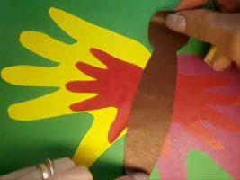 Этот мк, пожалуй, самый простой и доступен начинающим. Предлагается своими руками вырезать по контуру ладошку. Рисунок распечатывается на листах цветной бумаги и раздается малышам.