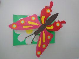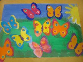 Еще дошкольникам можно предложить коллективную работу – выглядеть она будет богато, даже если качество бабочек будет различаться. За один урок изготовьте с детьми бумажные цветы, за второй – бабочек. Соедините все в прекрасную композицию!