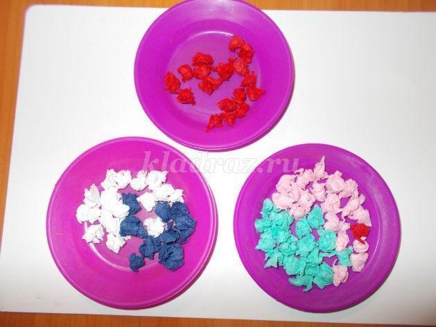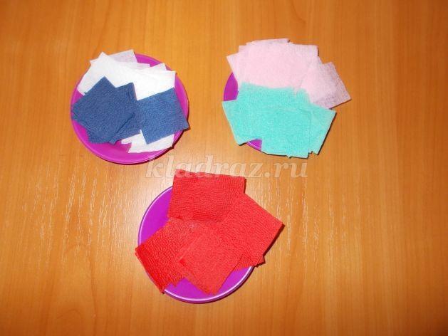 - Нарежьте цветные салфетки. Для детей будет интереснее, если они не порежут, а порвут каждую салфетку на множество тонких лоскутков.