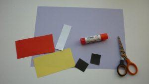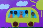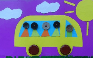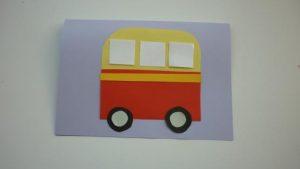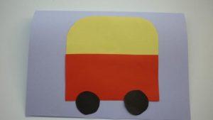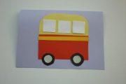 - Первая часть – подготовительная работа. Деткам раздаются шаблоны, по которым они обводят карандашом будущие детали (части корпуса, колеса, окна), из которых они соберут автобус.
