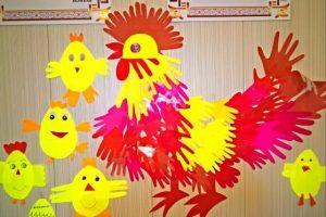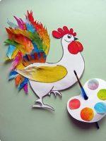 Самая простая поделка, которая понравится детям, – аппликация из ладошек на тему домашних птиц. Петушка можно сложить из обведённых по контуру и вырезанных из цветной бумаги детских ладошек. Заготовки наклеиваются рядами и имитируют пышные разноцветные перья петуха.