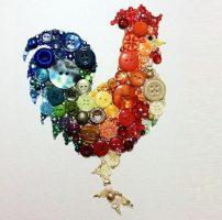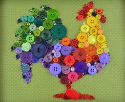 Аппликация из пуговиц наверняка понравится детям из старшей группы. Для этого понадобится контурный рисунок петушка, клей (лучше использовать клей-пистолет, так пуговицы будут прочно держаться на аппликации) и пуговицы. Основная сложность композиции из пуговиц заключается в правильном плотном размещении пуговичек разного диаметра на контурной схеме петуха. Зато результат впечатлит даже родителей.