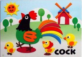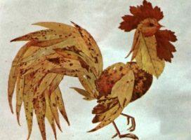 - аккуратно намазывая клеем заготовки с изнаночной стороны, поэтапно приклеить их к основе: сначала туловище, хвост, гребешок, затем крыло, глаза, бородку;