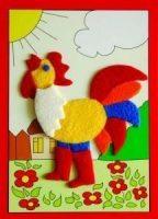 Простой вариант объёмной аппликации – петушок из ватных дисков. С работой справятся даже малыши, занимающиеся в младшей группе. Петух складывается из нескольких ватных дисков по принципу аппликации из бумажных кружков. Чтобы композиция имела объём, крылья и бородку петушка лучше сделать из свёрнутых ватных дисков. При желании готовую композицию можно раскрасить краской.