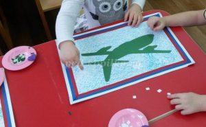 - Когда все готово, каждый подходит и наклеивает самолеты на общую картинку-аппликацию. Получается детское коллективное творчество в технике аппликации.