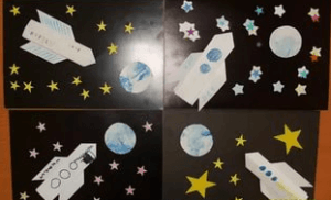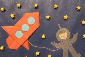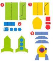 В подготовительной группе дети вполне способны на фантазийную работу, если дать им общую тему. Попробуйте и объемные аппликации. Объема можно достичь с помощью разных техник. Например, оригами ракета будет такой: