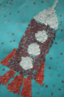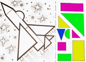 Для этого взрослый должен нарисовать по трафарету на нескольких листах одинаковые ракеты, которые дети будут заполнять рваными бумажными кусочками, опять же, по продемонстрированному им примеру.
