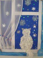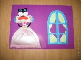 А для начала можно упростить «Кошкин дом» до аппликации – кошка на окошке. Дошкольникам понравится такое задание – посадить котенка на окно! Оформите окно бумажными лоскутами, а кошку вырезайте, используя трафареты.