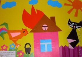 Дети постарше могут составлять работы сложнее. В старшей группе и в подготовительной группе давайте задания с большим количеством частей, но избегайте совсем мелких. Например, на тему «Кошкин дом».