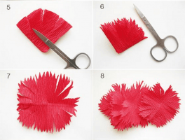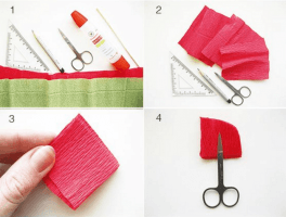 - Сложить лист гофрированной бумаги несколько раз, чтобы получилась многослойная полоска, разрезать по сгибам и нарезать полоску на небольшие квадратики (прямоугольники).