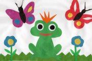 Аппликация лягушки, выполненная из кусочков ткани, наклеенной на бумагу, может быть выполнена даже трехлетним малышом. В то же время, смотрится она очень красиво и оригинально, может служить украшением детской.
