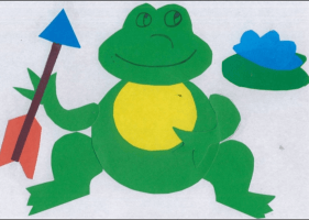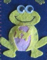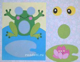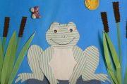 Лягушонок готов. Далее никаких ограничений для детской фантазии нет. Можно сделать обычную рамку из цветных полосок в тон аппликации, по такой схеме, как на фото.