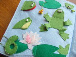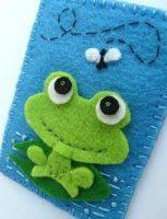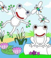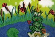 Получится еще забавнее, если основной фон заранее раскрасить голубой акварелью – это будет озеро. Украсьте его изображениями водяных листьев и кувшинок – картина получится вполне реалистичная. Если изобразить стрелу у «лапок» земноводного – получится иллюстрация к русской народной сказке «Царевна-лягушка». Здесь будет уместна небольшая корона, сделанная из ярких стразов или пайеток.