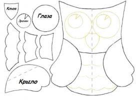 Для детей по такому же принципу, заменив нитки с иголкой на обыкновенный клей, можно предложить изготовить аппликацию из цветной бумаги. Детали в этом случае можно заранее разбить на части и распечатать на плотной бумаге, чтобы в дальнейшем использовать их как трафарет в младшей группе. Каждая часть совенка пошагово вырезается и наклеивается на предыдущую.