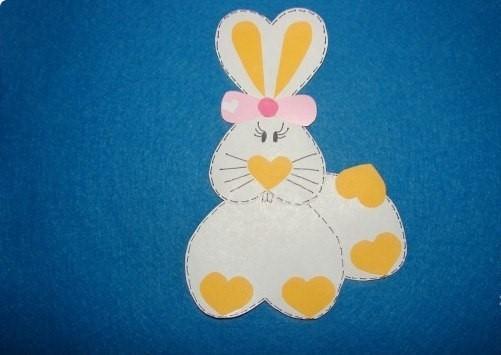 Еще один интересный вариант исполнения аппликации – зайчик из сердечек. Это может стать отличным вариантом для украшения открытки на День всех влюбленных. Причем из сердечек можно придумать самые разные вариации этого зверька.