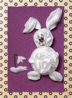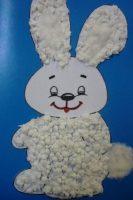 Но помимо этого «шерстку» зайца можно выполнить из салфеток. Для этого нужно смять и разорвать бумагу на мелкие кусочки, затем смочить их в клеевом растворе и приклеить на изображение.
