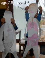 Контур человеческого тела можно нарисовать краской или карандашом, вылепить из пластилина. Шаблоны же для внутренних органов предлагаем сделать такие, как на фото, а уже при помощи взрослых крепить их в нужных местах. Таким образом с ребенком в форме игры получится изучить строение человека. Все эти шаблоны очень удачно сделать из пластилина.