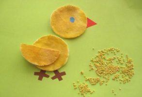 Инструкция выполнения очень проста. Круглый ватный диск – это тело или голова (например, цыплёнка), половина ватного диска – крыло или хвост. Ватные диски необходимо покрасить краской, при необходимости разрезать, составить из них птичек и приклеить к основе. Пластилин дополнит аппликацию. Из него можно сделать лапки, гребешки, бородки, глазки.