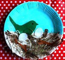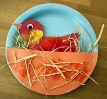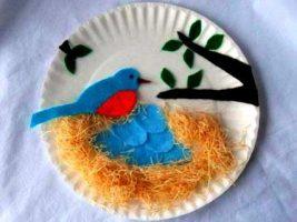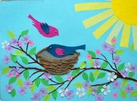 Весной птицы возвращаются домой и селятся в гнёздах. Этот период жизни птиц также можно изобразить аппликацией. Оригинальный вариант – гнёздышки в бумажной тарелке. Для такой аппликации можно использовать различные материалы и подобно пернатым самому сплести гнездо.