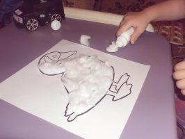Курочек и гусей можно украсить с помощью ваты. Для этого достаточно распечатать изображение птиц, подготовить вату и клей ПВА. Скатывая вату в небольшие шарики, необходимо заполнить изображение по контуру. Вата отлично имитирует птичье оперение. При желании аппликацию можно раскрасить красками.