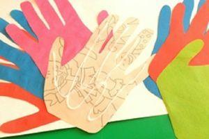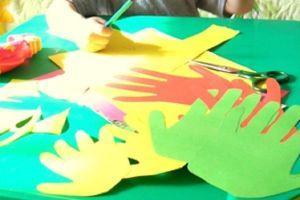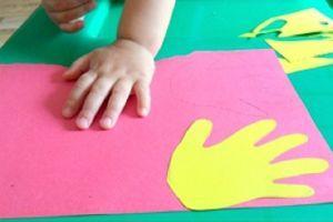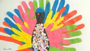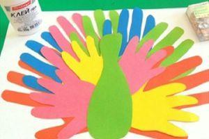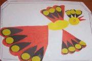 Удивительную птицу можно сделать разными способами. Например, из ладошек. Обведённые ладошки вырезать из разноцветной бумаги и приклеить веером – получится хвост. Остаётся сверху наклеить тело птицы. Пошагово выполнение показано в фотографиях.