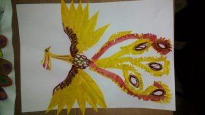 Другой вариант хорошо подходит для коллективной работы. Пусть каждый ребёнок раскрасит и оформит одно пёрышко из хвоста жар-птицы на своё усмотрение. Когда все перья будут готовы, их необходимо собрать в пышный хвост.