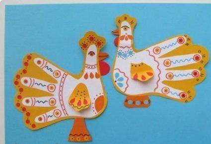 - приклеить «оперение» к курочке и петушку (чтобы детки легко справились с работой, можно нарисовать на заготовках схему, по которой приклеиваются все элементы);