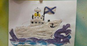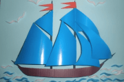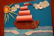 Это один из самых простых вариантов изготовления панно-аппликации, с которым справится ребенок даже в детском саду. Суть этой поделки заключается в том, чтобы вырезать по заранее распечатанному шаблону детали корабля, а потом наклеить их на подготовленный фон.