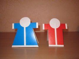 - С помощью ножниц вырезаем из сложенного пополам картона одежду Деда Мороза и Снегурочки в точности, как показано на фото. Для детей можно подготовить трафареты заранее.