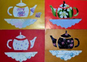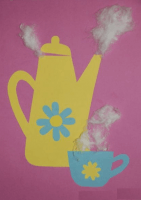 В старшей группе можно использовать для аппликации кусочки разноцветной ткани. Например, у вас может получиться вот такой симпатичный чайники с чаем: