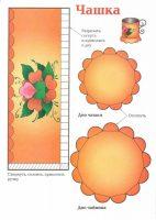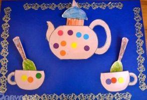 Есть и более интересные схемы создания чайных принадлежностей, которые подойдут для малышей от 3 лет. Им будет интересно создать, например, красивую открытку для мамы на 8 марта с аппликацией на тему посуды – в таком стиле: