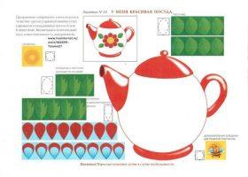 По теме посуды можно создавать много интересных поделок. Больше всего малышам нравятся вариации с подвижными деталями, которыми можно играть. Делать такую работу можно в младшей группе, или в средней группе – в итоге у вас должна получиться такая картинка: