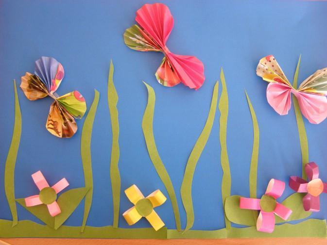 - Чтобы дополнить эту аппликацию о лете, сделайте еще и бабочек. Для этого у прямоугольных отрезков бумаги закруглите углы.