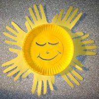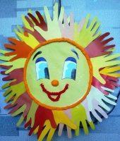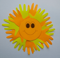 Вот такое солнце вырежьте из предложенной картинки, приклейте на основу, лучи сделайте из ладошек.