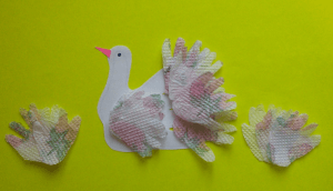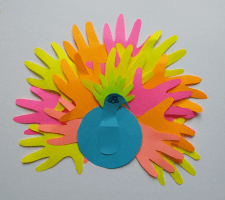 Детская поделка готова. Чтобы хвост был пышней, а фигурка птицы объемней, сделайте аппликацию из маленьких ладошек и с ватным диском.