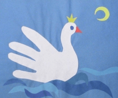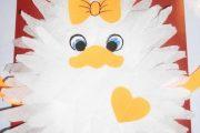 Для создания лебедя вырежьте из белой бумаги туловище и крыло. Клюв сделайте красным. Нарисуйте его цветным карандашом или акварелью. Дополните из ладошек аппликацию лебедя воздушными крыльями, для которых используйте салфетки или тонкую шифоновую ткань.