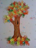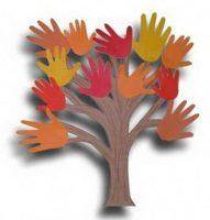 Такой вид аппликации очень нравится детям. Особенно интересно смотрятся коллективные работы. Заранее готовим ствол дерева, а листиками у нас будут детские ладошки.