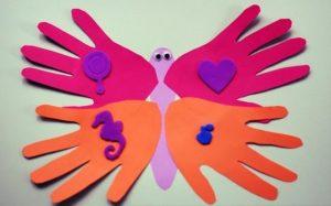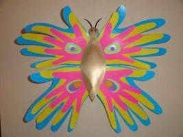 Добавьте к композиции из ладошек аппликацию бабочки. Как описывалось ранее, воспользуйтесь шаблонами. Голову насекомого сделайте из небольшого кружочка, туловище — овальным.