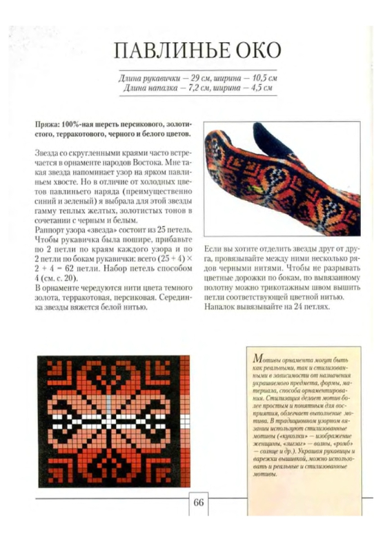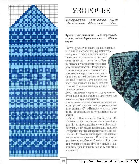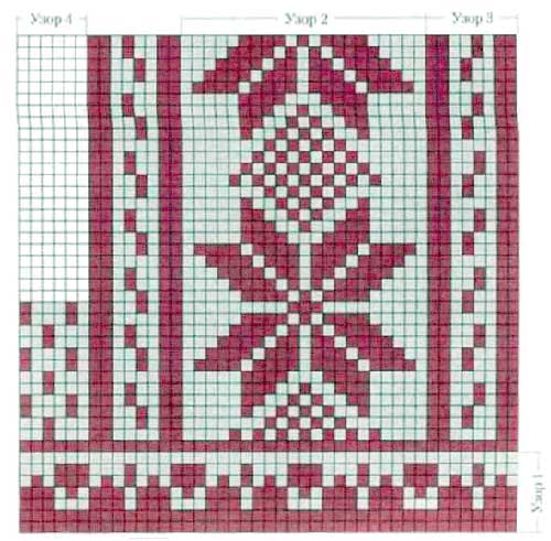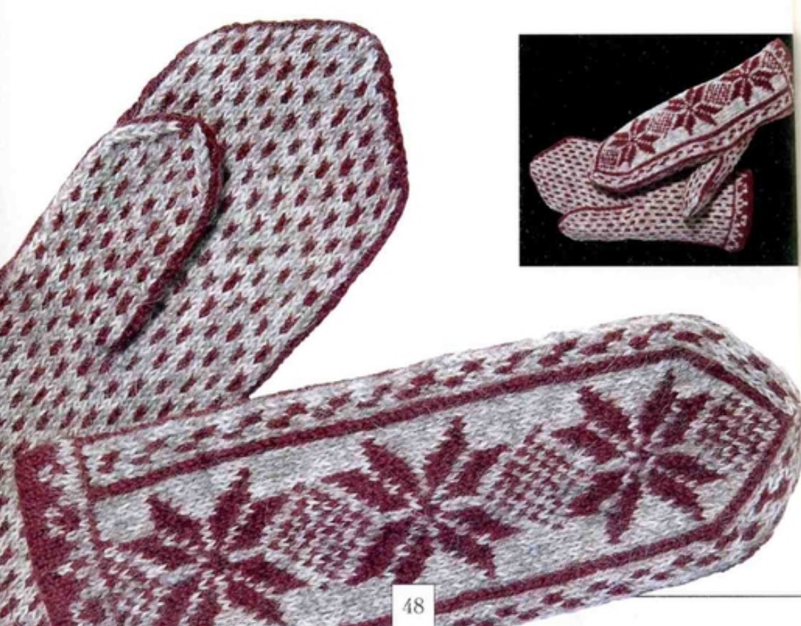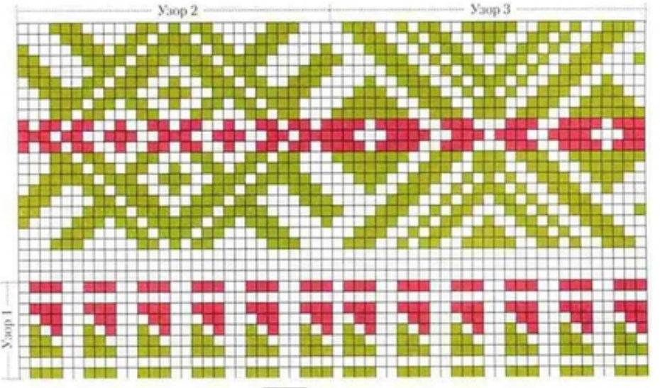 Край рукавицы с узором (далее – У) 1 отделен от остальных У рядом, связанным бордовой ниткой.
