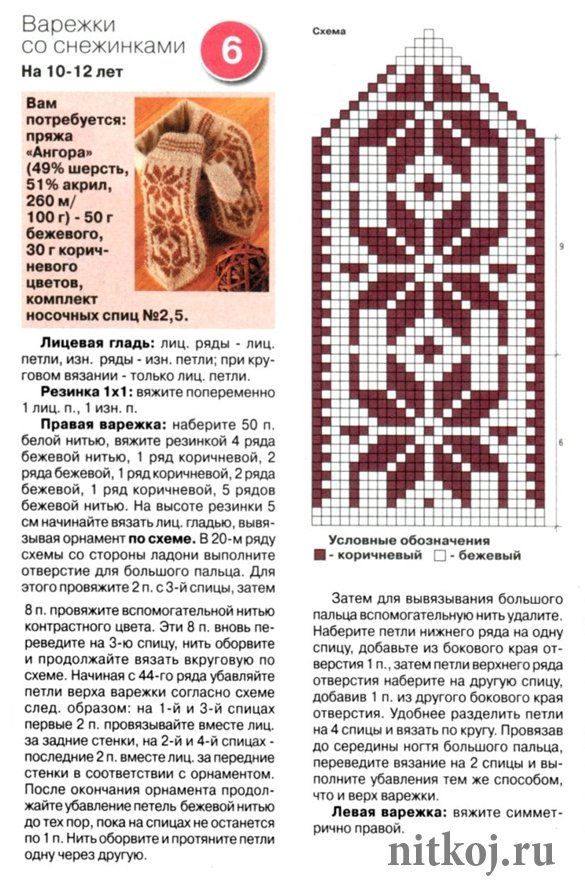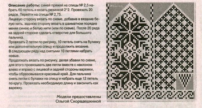 По бокам рукавички между мотивами У № 1 провязываем не 2, а 1 п. белой ниткой (смотрим схему). При вязании
