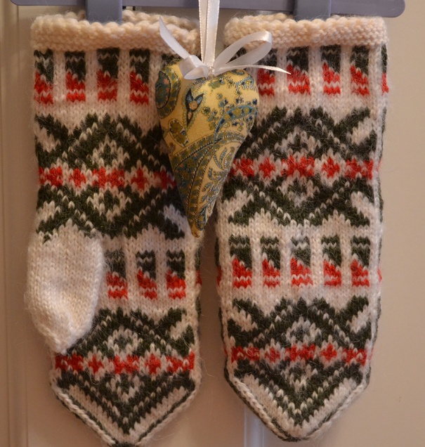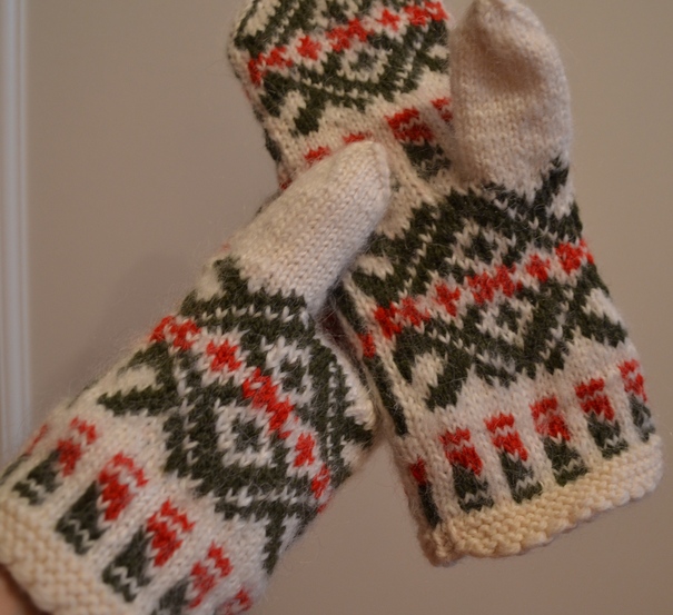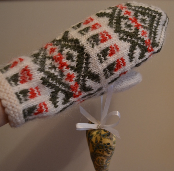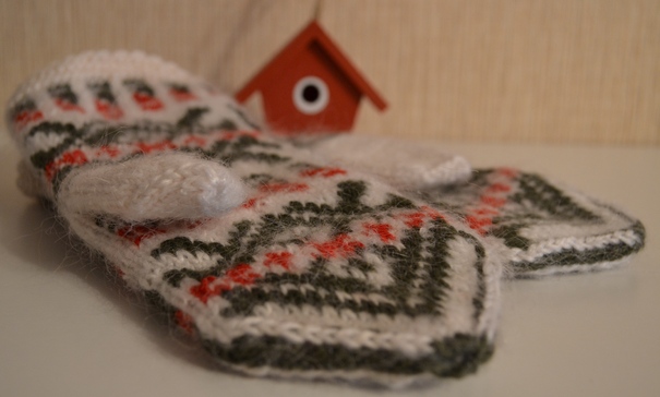 Узор из зеленой и бледно-красной ниток на белом фоне напоминает расписные каргопольские игрушки, именно поэтому варежки имеют такое название.