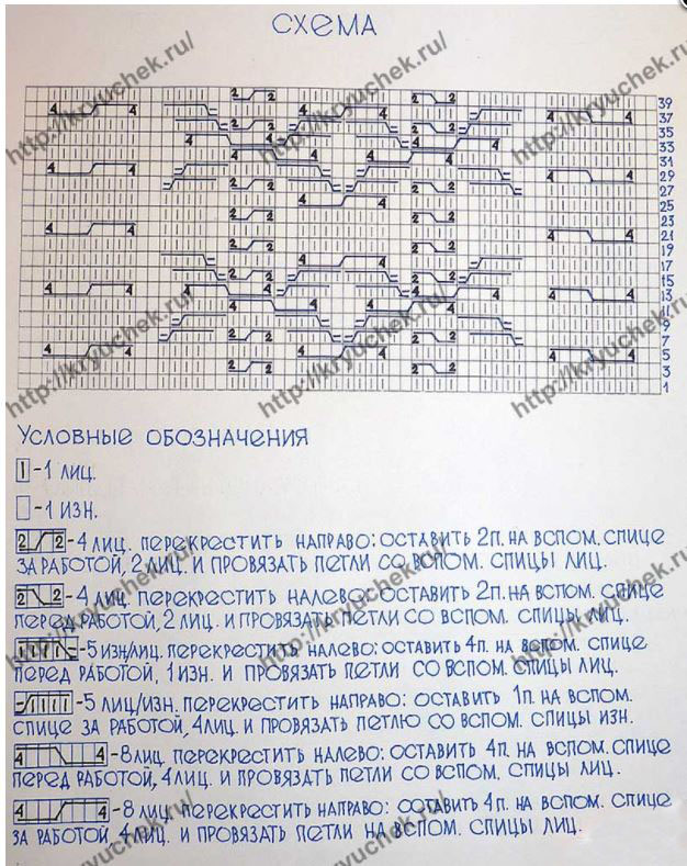 Работать следует по схеме. На ней показаны только лицевые р., а в изнаночных р. вязание выполняем по рисунку.