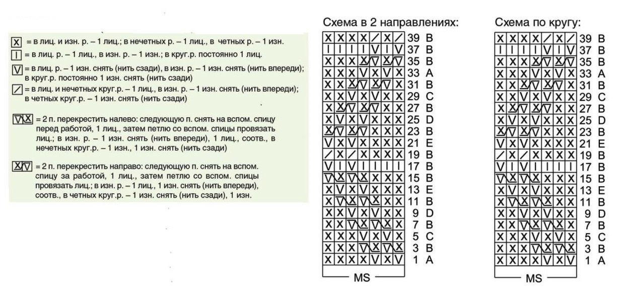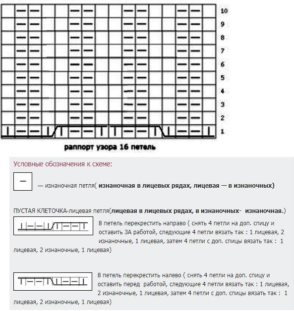- 2р. (изнаночный): *4и., 1и. переносим, 1и., 1и. переносим, 4и.*;
