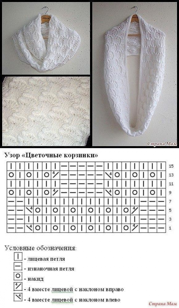 Схемы и описания представлены для вязания снуда прямыми/обратными рядами и вкруговую.