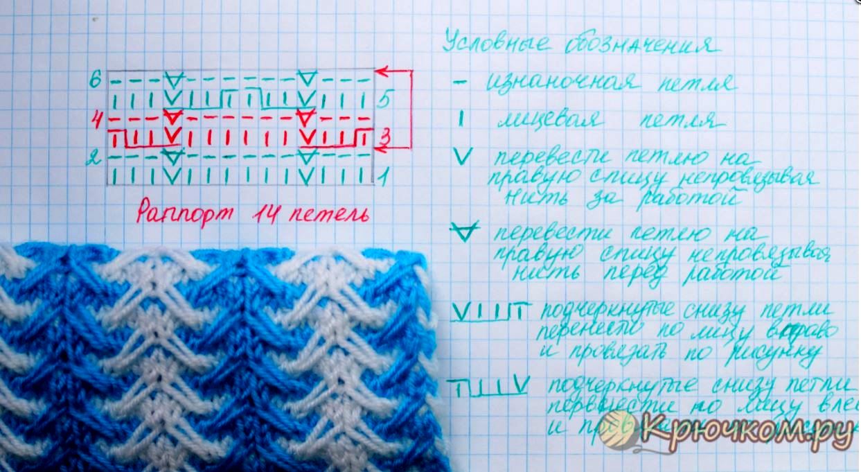 Раппорт узора состоит из 14 п. + 2 кром. Лицевая сторона формируется на нечетных рядках, изнаночная – на четных.