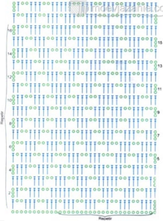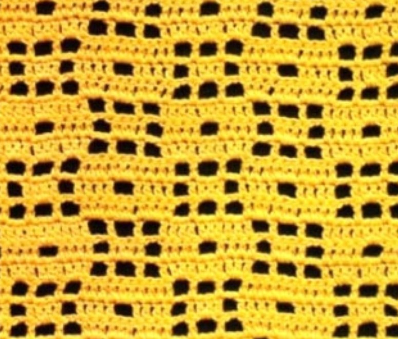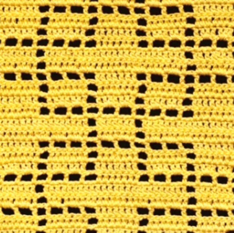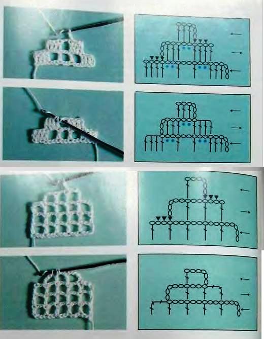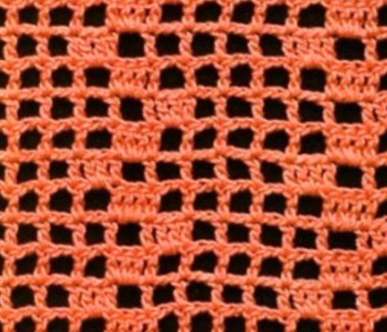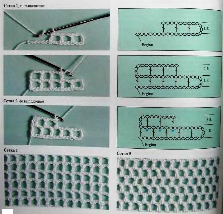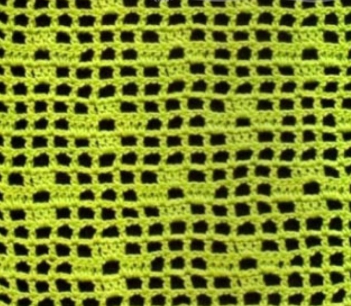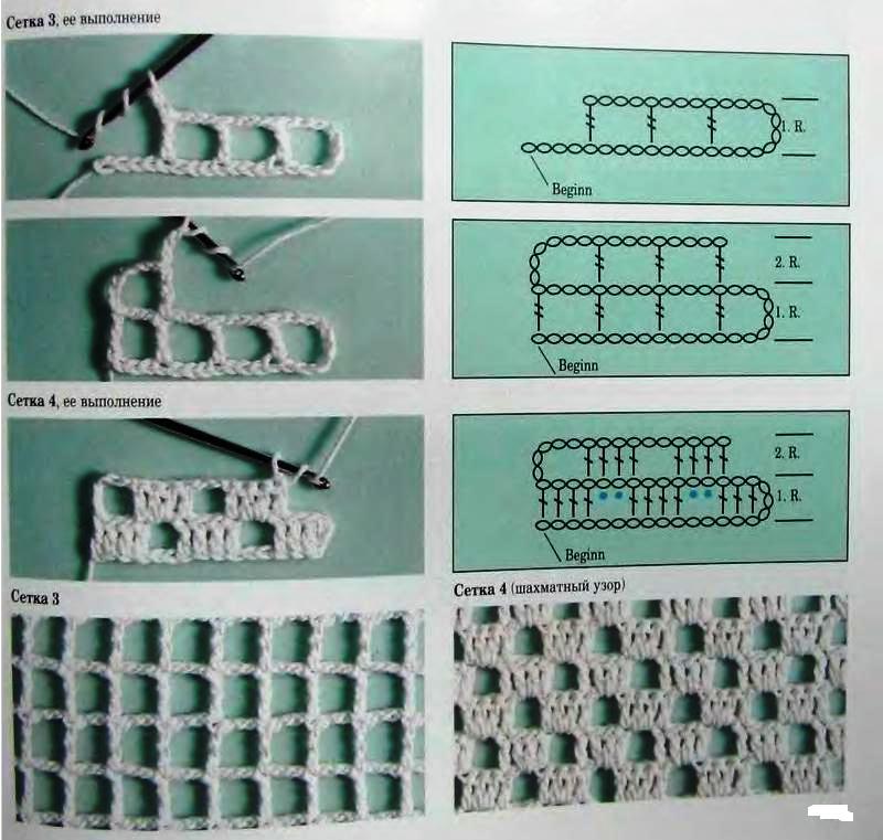 Ниже приведен пример вывязывания сеточки, где чередуются столбик с накидом и две воздушные петли, а заполненная клеточка состоит из трех столбиков с накидом. Обратите внимание на фото ниже, схема располагается справа: