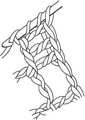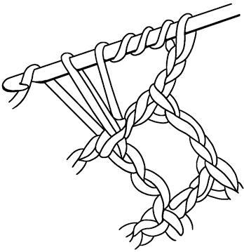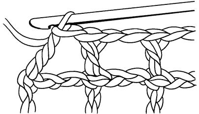 Чтобы прибавить сразу несколько заполненных клеточек в начале рядка, рассчитываем количество в. п. п. Например, для вязания двух дополнительных ячеек надо: 3 в. п. для средней клеточки + 5 в. п. п. для дальней клетки. Провязав их, вяжем с. с н. с 4-й п. от крючка.