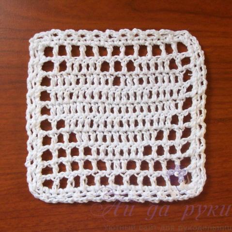 Такие небольшие образцы в технике филейного вязания могут быть использованы самостоятельно, в качестве подставки или салфетки, или как один элемент вязаного покрывала. Размер салфеточки составляет 9 х 9 см.
