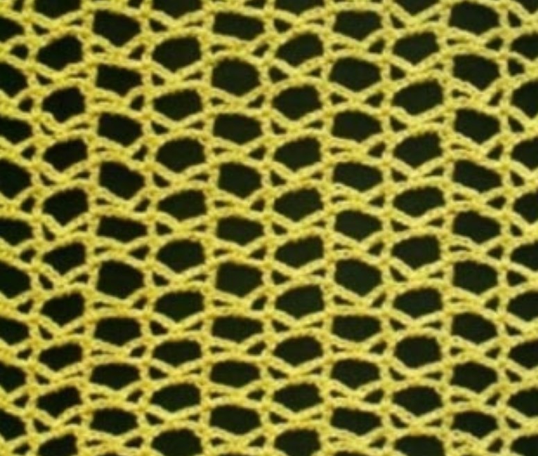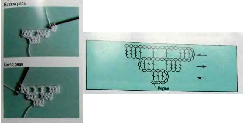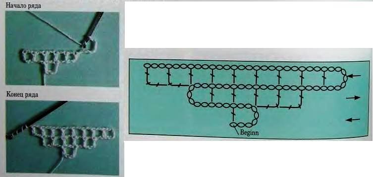 - 4 р.: *5 в. п., 4 с. с н., 2 в. п., 4 с. с н., 2 в. п., 16 с. с н., повторяем эту схему снова и поворачиваем вязание.